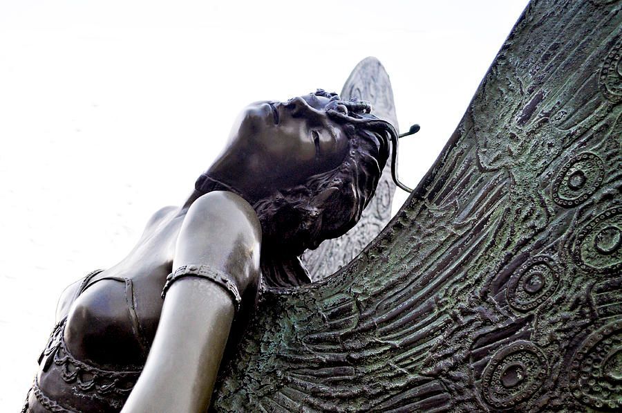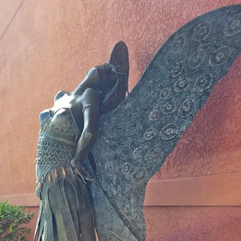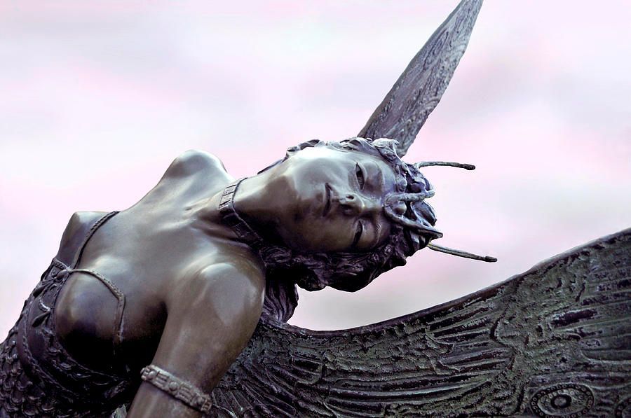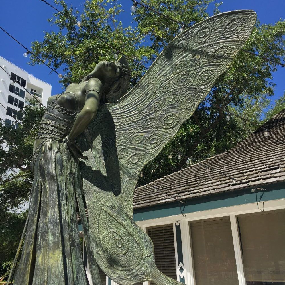 The original version of this piece, sculpted in the late 19th century, graces a small street in Brussels, Belgium. The subject is that of a nature sprite, a girl with butterfly wings wearing a long tunic that hides her lower limbs. Fairy imagery was fashionable in 19th century art as it allowed the partially draped female figure to be displayed openly in communities where local sensibilities might have condemned a nude as inappropriate for public it. This sculpture has a sister piece located in Sarasota and is titled "Butterfly Lady".